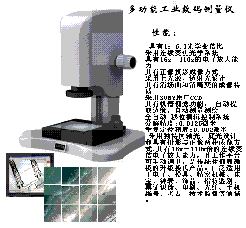 是以現代光學為基礎,運用數字圖像處理、計算機通信和機器視覺系統為一體的現代視覺系統的綜合運用。 視覺測量 視覺檢測 視覺定位 視覺分析 集合了數字科技成果與計算機屏幕測量技術的數碼投影測量系統,它應用了獨有的雙向同步倍率校正技術(專利),采用獨特同軸光、底光、側光設計和具有投影與正像兩種成像方式,測量精度為±2um,分辨率0.001mm.能夠有效的解決了電子產品的誤差和屏幕的局限和滿足各種倍率的要求。產品是針對精密電子產品檢測制造業日益精湛的加工工藝所帶來的精確需求開發而成。 MTC280系列機器視覺系統是機器視覺檢測、測量. 識別、定位.與嵌入式ARM等高技術軟件開發,目前已廣泛應用于裝備制造、工業部件檢測、包裝檢測、印刷檢測、工業測量、劃痕(工損檢測)設備運動識別、定位等領域。提供實用、先進的解決方案服務于相關行業的開拓者。“技術創新與企業實際需求相結合”是產品開發的主導思想,也是我們提供產品和服務的指導思想。 MTC280系列機器視覺系統為解決現代工業產品生產過程中涉及的各種各樣的檢查、測量和識別、定位等問題推出的一套機器視覺系統解決方案。適用于大批量生產過程中的質量檢查,如:零件裝配完整性,裝配尺寸精度,零件加工精度,位置/角度測量,零件識別,特性/字符識別等。 應用行業:汽車,制藥,電子與電氣,制造,包裝/食品/飲料,醫學等。如對汽車儀表盤加工精度的檢查,高速貼片機上對電子元件的快速定位,對管腳數目的檢查,對IC表面印字符的辨識,膠囊生產中對膠囊壁厚和外觀缺陷的檢查,軸承生產中對滾珠數量和破損情況的檢查,食品包裝上面對生產日期的辨識,對標簽貼放位置的檢查。二、視覺系統特性: 1、 獨立的高速處理器,保障在線檢測速度要求 2、 嵌入式軟、硬件結構、保證系統高穩定性和可靠性 3、能方便的與生產線設備連接/應用 4、系統操作簡單、方便5、 提供多種視頻圖像輸入輸出、I/O控制、通訊等接口 6、 豐富的TCP/IP控制命令 7. 擁有光學強大的檢測功能 強大的信息采集和信息共享功能 8.尺寸測量.CNC走位自動測量 9.自動學習批量測量檢測定位等.10.CNC掃描批量測量檢測定位等11.自動對焦輔助測高,12影像地圖全屏牽引,13.鷹眼縮放精確回位,14SPC報告超標報警; CAD逆向測繪15. CNC快速測量檢測定位等,16.空間坐標旋轉,17.內置 SPC 功能,18實時修正誤差 ,19定位識別 /信息采集對比等功能20.統計分析.21.信息采集導入CAD導出軌跡功能,測精度為±2um。信息采集1秒/4-10次.誤查精度±2um,取像時間/運算時間250-100毫秒/視野250FOV/秒
