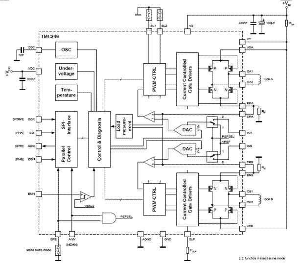 TMC249則是高電流版本的TMC246。該產品能支持由外部MOSFET設置的高達75VDC/10A電流。該驅動芯片還適用于單極步進電機。在用于單極電機操作時只需4個外部PMOS晶體管。
