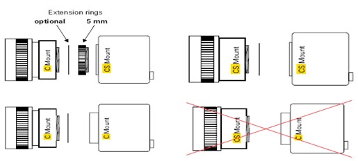 從機(jī)械的角度,各種C接口鏡頭的背焦距太長。另外,C接口鏡頭的光學(xué)特性不能總適合3CCD相機(jī)。因此,需要考慮相機(jī)廠商提供的兼容性列表。下圖所示就是C接口與CS接口之間正確的匹配和不正確的匹配方法。本文來自機(jī)器視覺商城(www.china-vision.com.cn